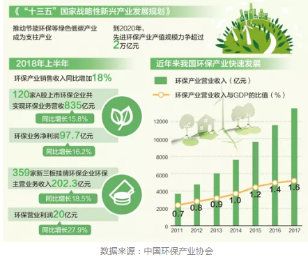 今年以來,隨著美麗中國建設、污染防治攻堅戰深入開展,龐大的環保市場空間持續釋放,環保產業保持較快發展的好勢頭,經濟、社會、環境效益顯著,環保產業已成為我國重要的戰略性新興產業之一。《“十三五”國家戰略性新興產業發展規劃》提出,推動節能環保等綠色低碳產業成為支柱產業,到2020年,先進環保產業產值規模力爭超過2萬億元。